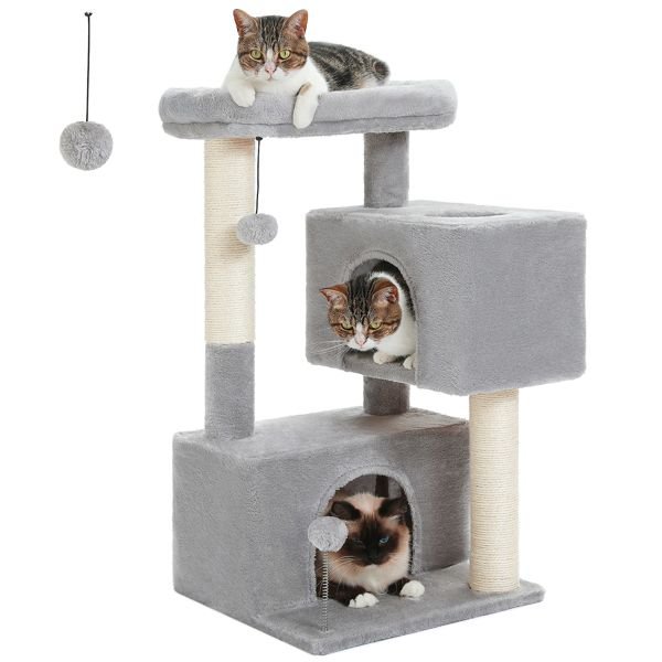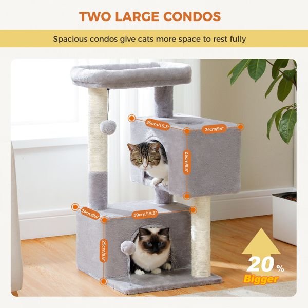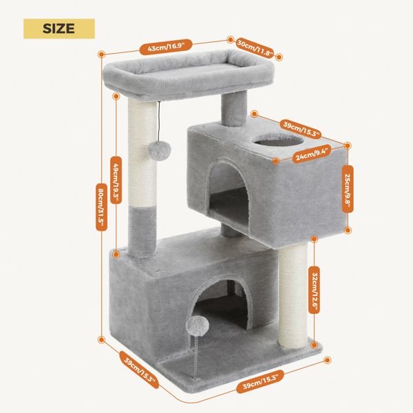 Perfect Height for Climbing and Play: Our Cat Tree stands at a height of [32''=80CM], featuring with 2 large cat condos, 1 cat perch and 2 cat scratching post, create an ideal space for your cats to climb and play. It's compact but utility, and very suitable to put in apartment.