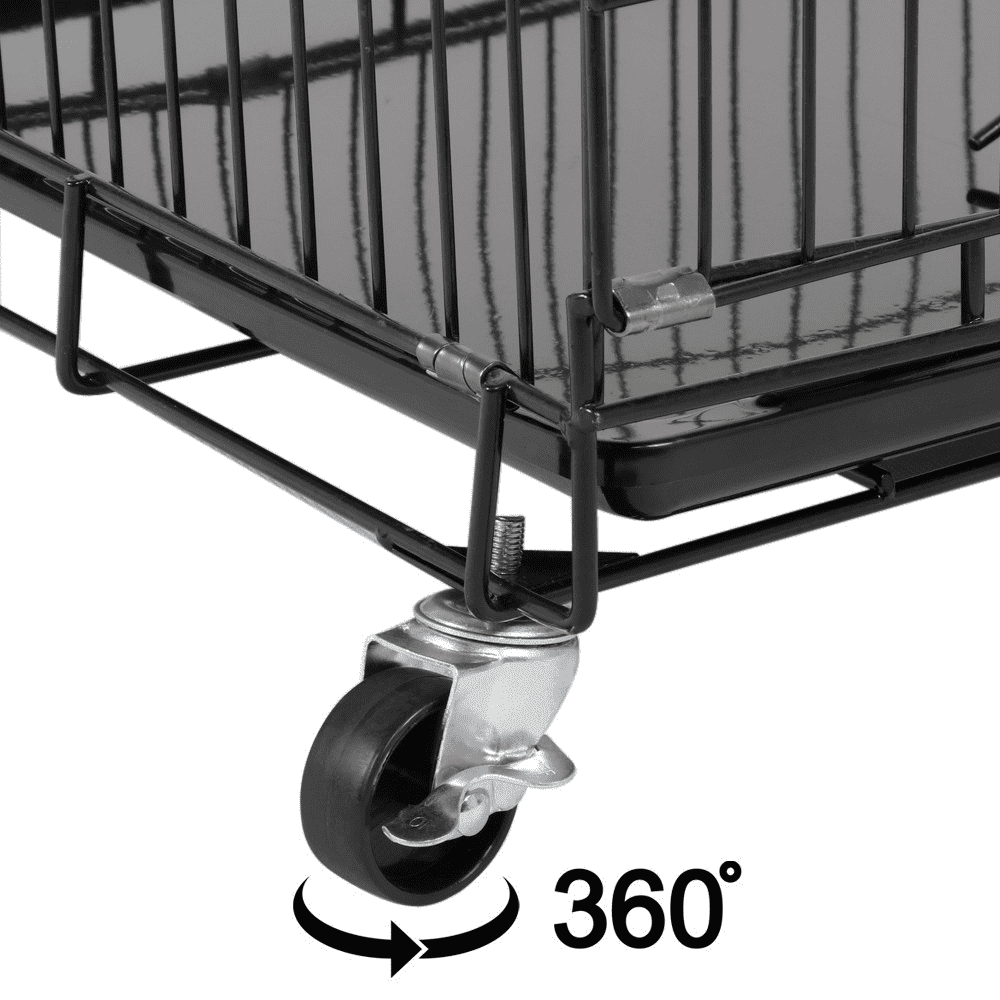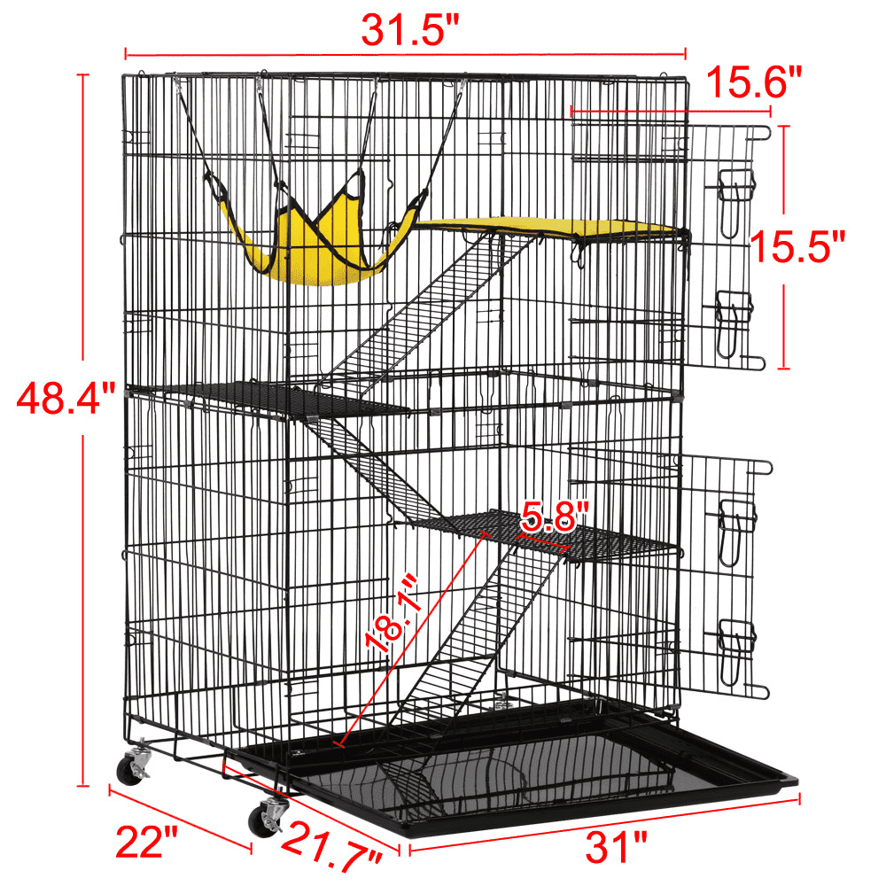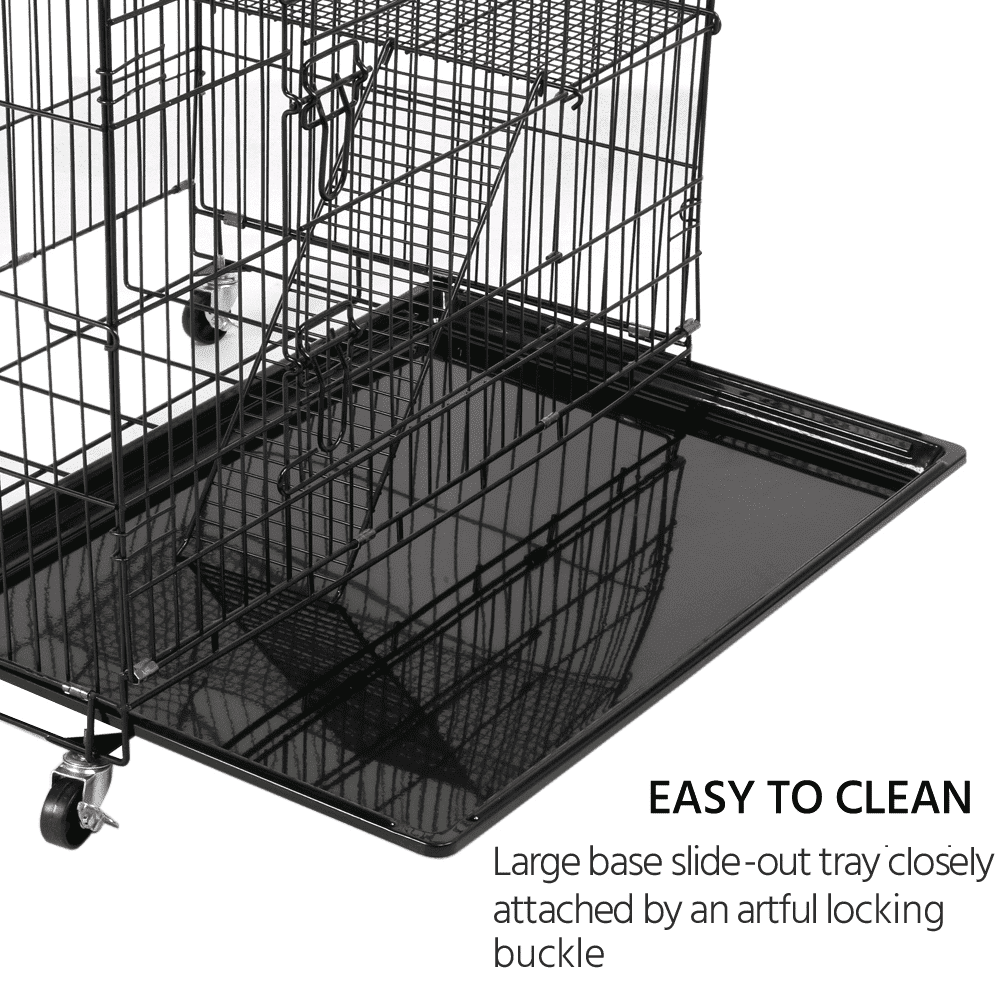 This 4-tier cat cage has a well-built structure made of harmless finished iron. As a detail-oriented pet cage; it boasts a sturdy staircase; quality hammock/bedding; an easy-to-clean litter tray at the bottom; secured cage lock; and brake casters; which makes it an ideal choice of the rolling cage for pet parents. Also; the cage applies user-friendly construction and comes along with easy-to-read worry-free assembly instructions in the package.