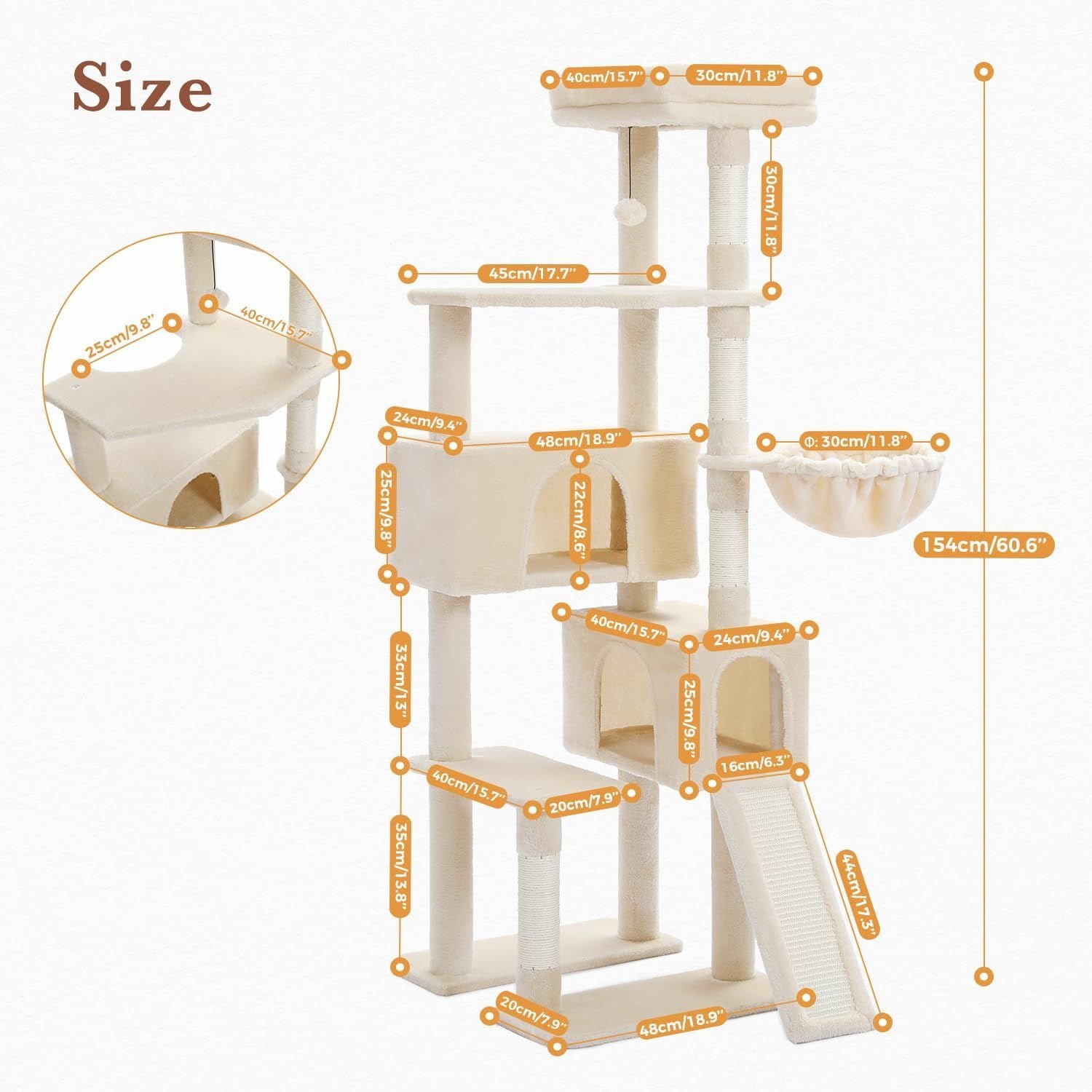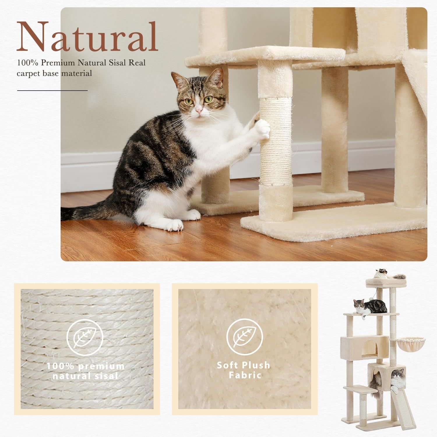• [IDEAL CAT ACTIVITY CENTER]: With a spacious condo, a large plush canopy, a roomy hammock, natural sisal-covered scratching posts, and a removable pom-pom hanging ball, this 61-inch cat tree is perfect for entertaining and lounging.