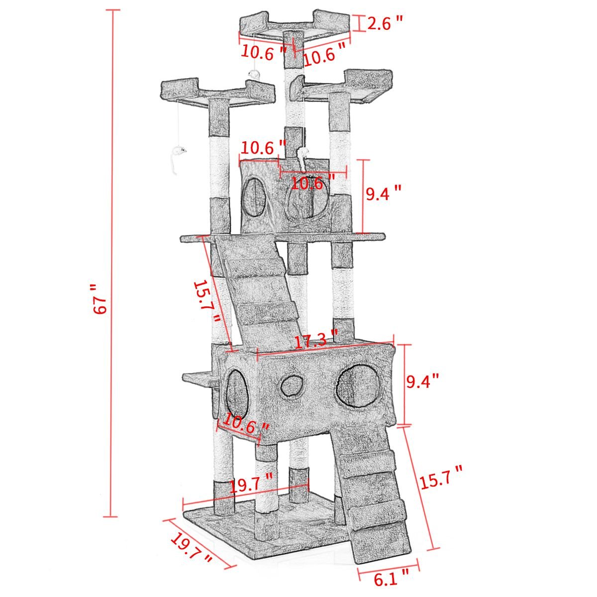 [Kitten Activity Center]: Coming with 2 large condo houses, 3 relaxing perches with raised edging, 4 hanging mouse toys and 2 climbing ladders, this multi-layer cat tree can perfectly meet your cat's needs for playing or relaxing.