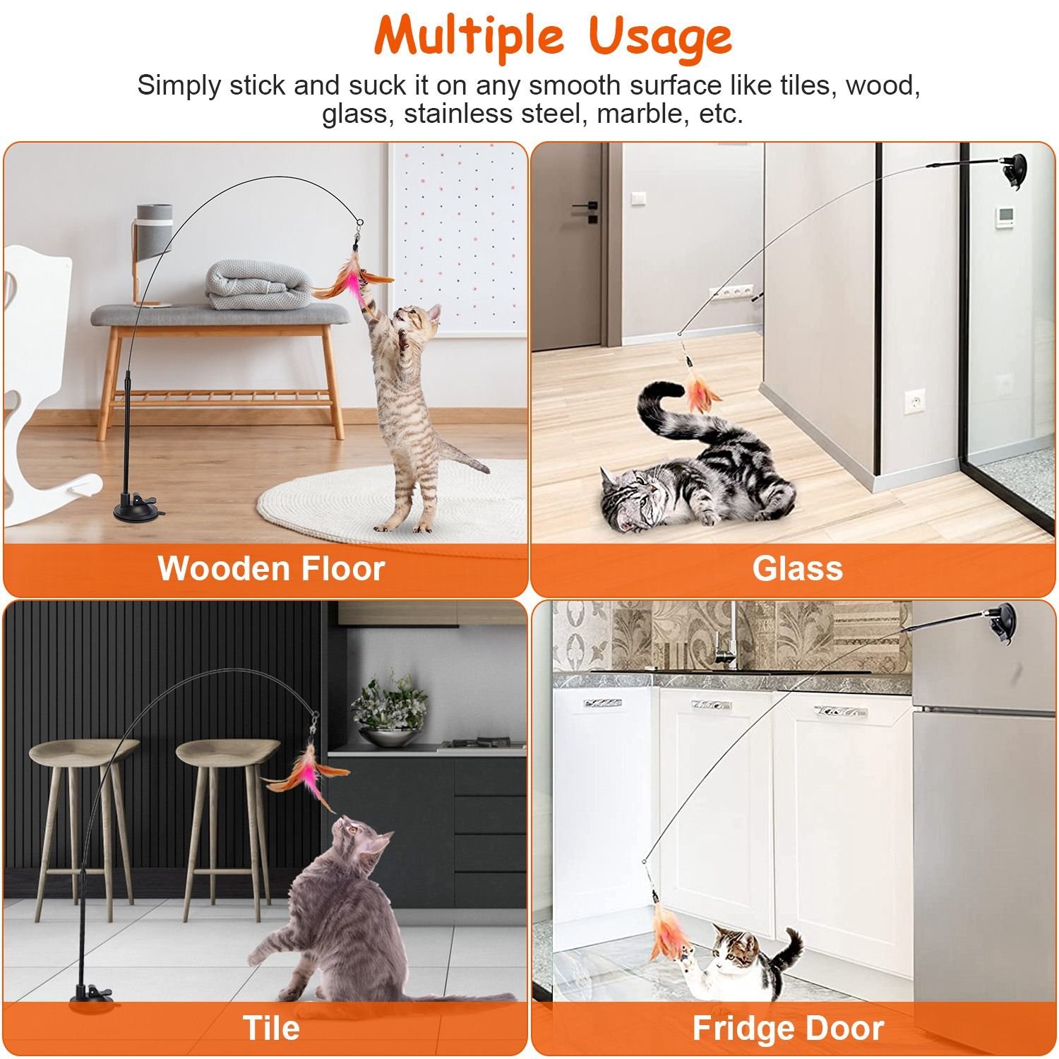 * 2 Interactive Modes*: Come with 2 feather wands; you can hold the stick to tease your cat with feathers and bell; or insert it into the suction base to let your kitty play itself!