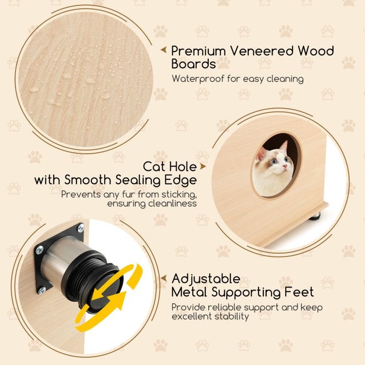 4.Humanized Features: This wooden cat house is supported by adjustable metal supporting feet, which provide reliable support and keep excellent stability on any surface. Additionally, it boasts a cat hole with smooth sealing edge, which prevents any fur from sticking, ensuring cleanliness.