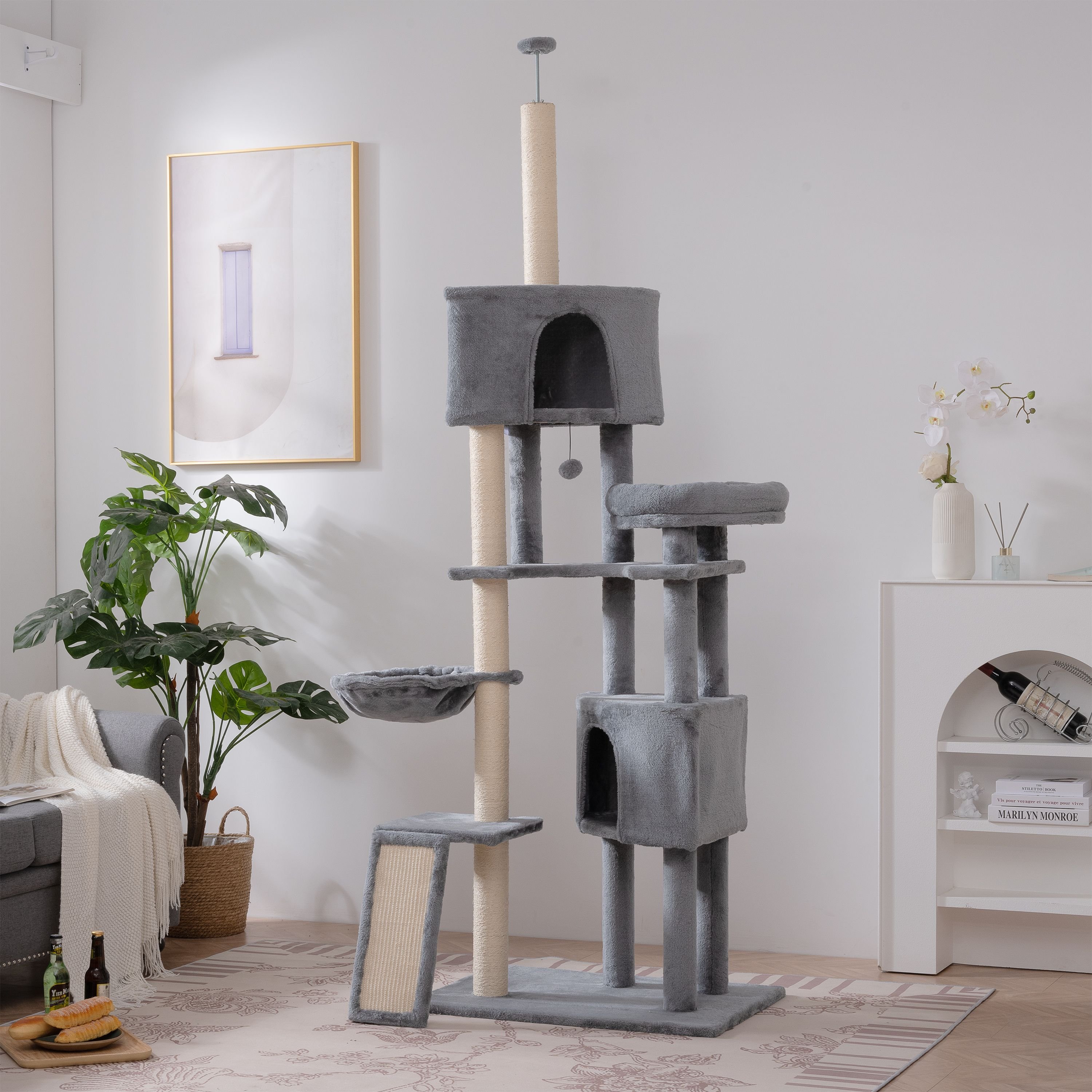 Specifications:Overall Size: 104.3inch X 29.5inch X 21.6inchMax Total Height: inch:105.5inchTwo Spacious Luxury Condos& one Plush PerchesTwo Cat condo size: 15.7*12.2inchPlush Perches size: 15.7inch circleBase plate size: 29.5*21.6inchCat hammock size: 13.7inch circle