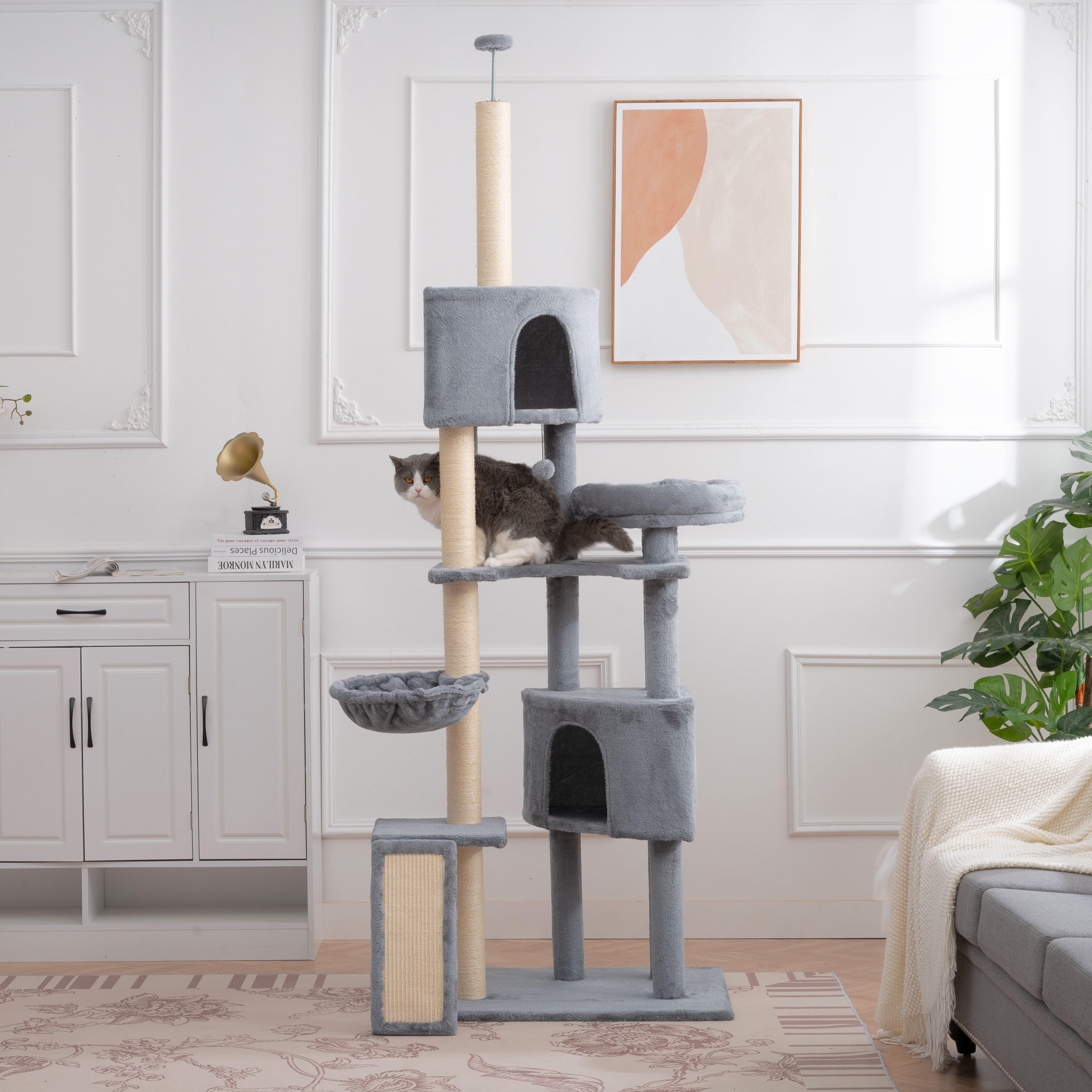 1. Gray super high can reach the roof, the height is adjustable2. Two cat nests, four perches and a COZY basket3. The maximum height is 2.68 meters, and the tall ceiling design can reach the suspended ceiling, which can make the cat climb higher and ensure safety.4. Environmental flannelette specification 220g/m², non-toxic and tasteless.5. Equipped with safety rope + rivets, the product can be fixed on the wall. it is strong enough suitable for Medium cats and Big cats, Heavy cats or multiple cats.