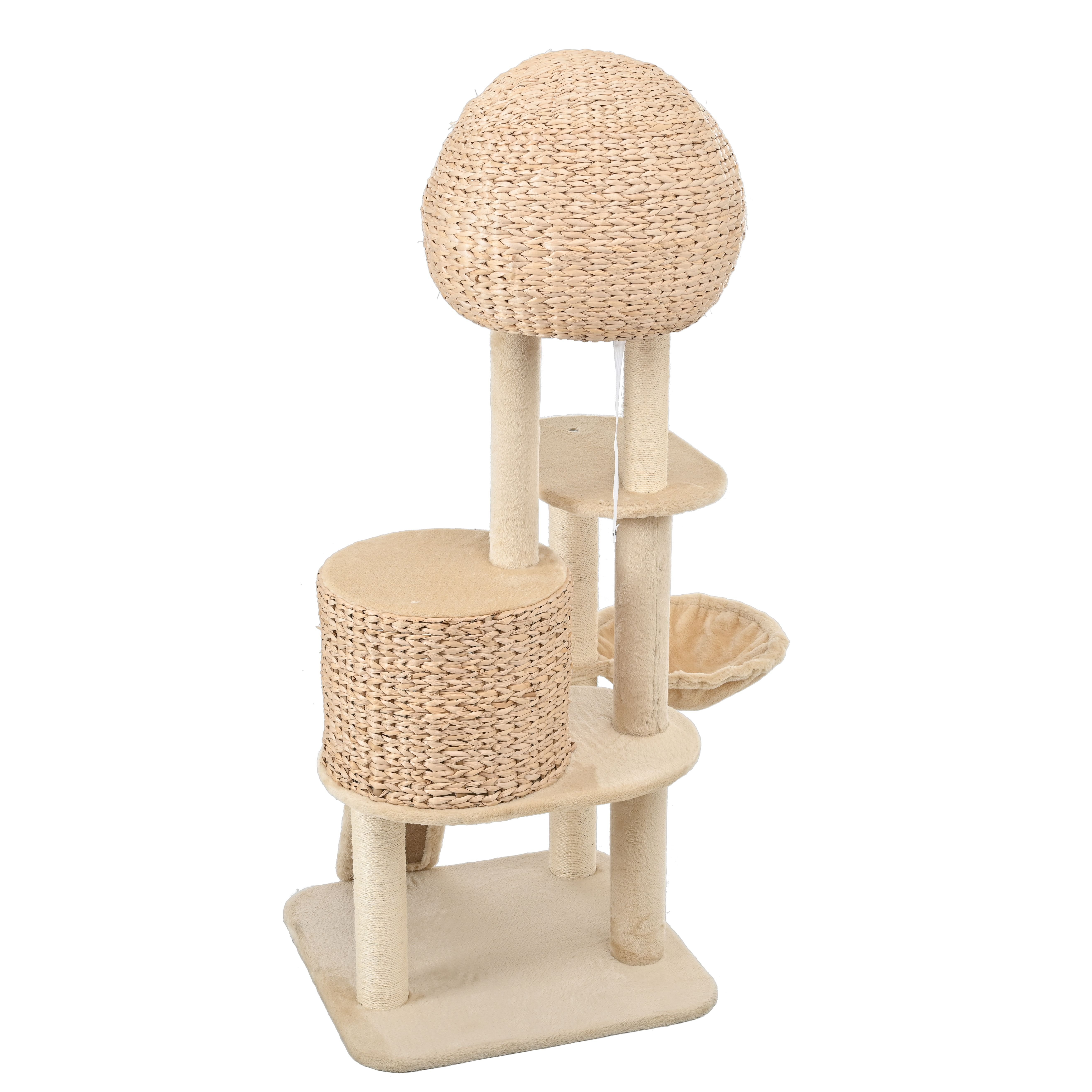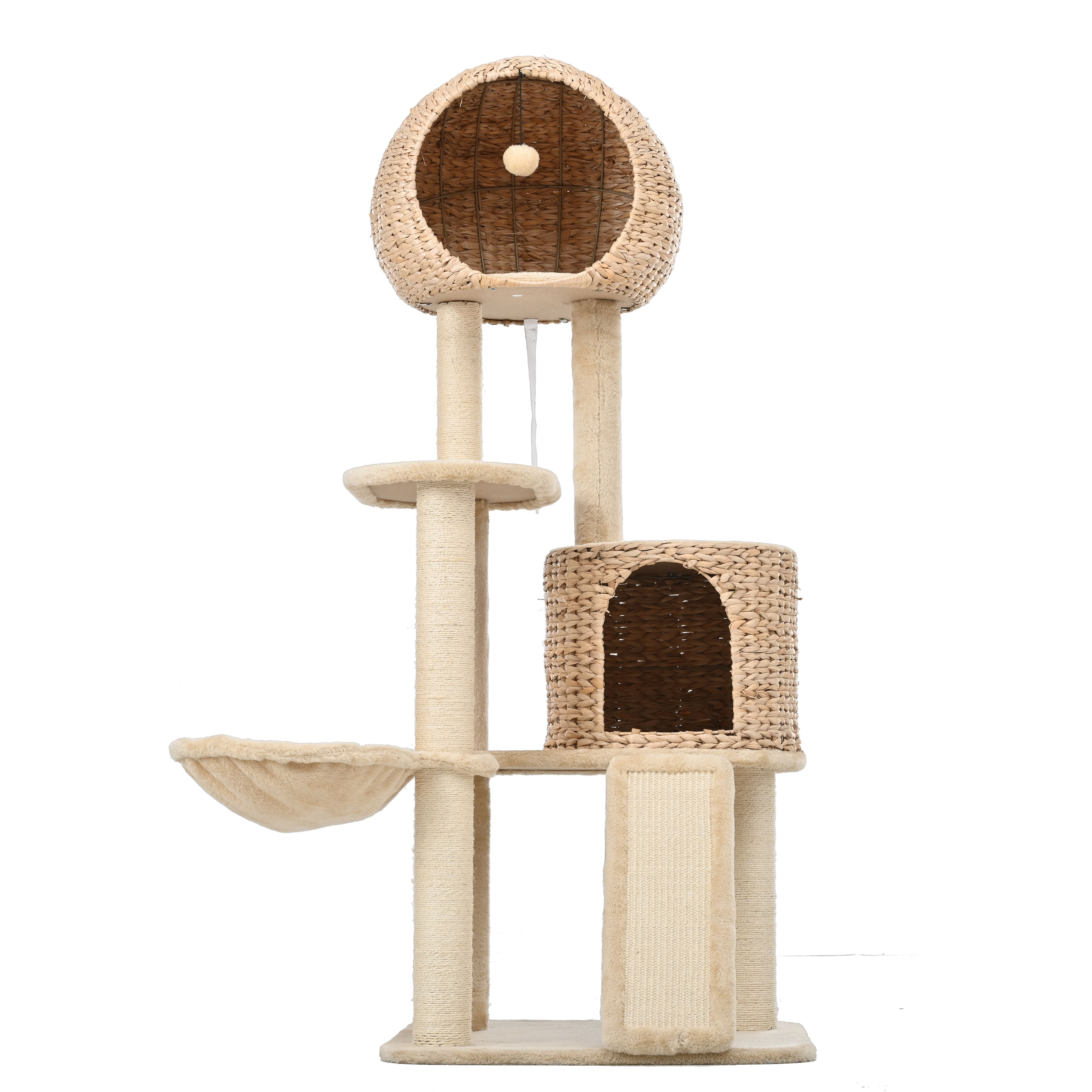 1. Beige hand-woven double house cat tree, large size cat nest, accommodating 3 to 4 cats to play at the same time2. Two cat nests plus a hammock. Cat nests are hand-woven from natural pushgrass.3. The board adopts P2 degree MDF board, which meets all environmental standards.4. The tubular is made of high hardness Kraft Paper Pillar wrapped with natural sisal rope. And each scratching post is covered by natural sisal ropes that are safe for cats to scratch, Natrial sisal material Scratch-resistant and non-chipping.5, the product is stable, The cat tree is equipped with multiple big sisal scratching posts, The wide and heavy base provides overall stability. meanwhile it is equipped with safety rope + rivets, can be fixed on the wall.