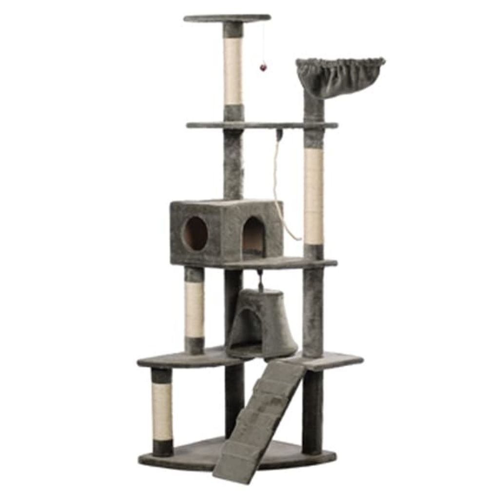 The plush carpeted surface provides extra comfort. The scratch poles are wrapped with sisal ropes for your pets to scratch and play with. It also has a ladder, play strings, houses, balconies and a basket to keep your cat busy as well as have a comfortable rest.
