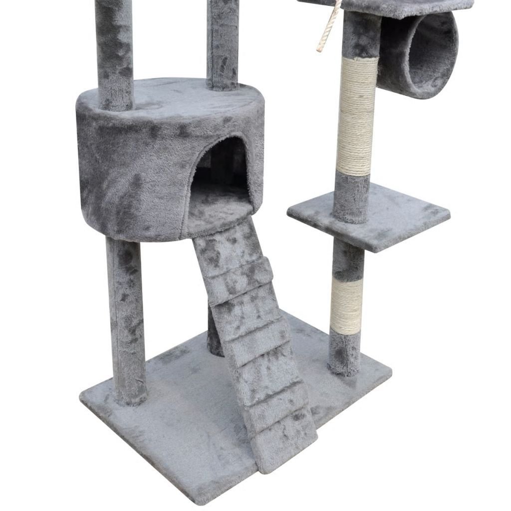 The plush carpeted surface provides extra comfort. The scratch poles are wrapped with sisal ropes for your pets to scratch and play with. There is a house where your cat can hide safely. It also has a ladder, 2 play-strings, 2 baskets, 1 top play-pole, 2 tunnels and multiple decks to keep your cat busy as well as have a comfortable rest.