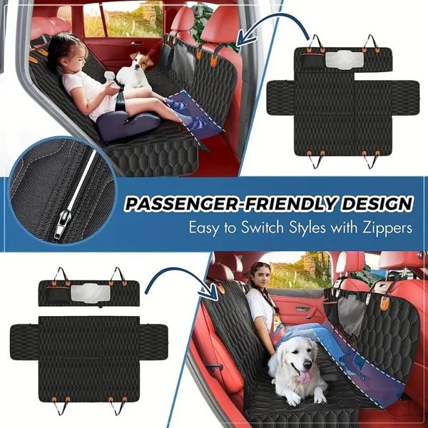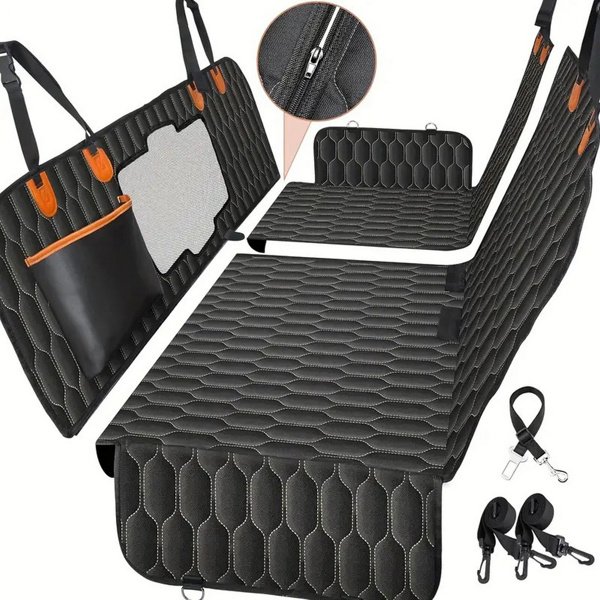 Waterproof and Durable: This dog rear seat cover is made of waterproof material, ensuring that your car seat remains dry and clean even if your furry friend has an accident or brings in wet paws. The high-quality construction makes it extremely durable, able to withstand daily use and wear. For example, it can handle spilled water during a dog's excited drinking or resist stains from muddy paws.Side Wings for Full Protection: The side wings provide comprehensive coverage, protecting not only the seat but also the sides of your car from scratches and dirt. Your vehicle's interior is safeguarded from all angles. It's like having a shield that prevents any damage, even when your dog is moving around excitedly.Scratch Resistant Design: Say goodbye to scratches on your car seats. This cover is specially designed to be scratch resistant, protecting your seats from your dog's claws. Whether your dog is jumping in or out of the car, you don't have to worry about unsightly marks. Imagine having a pristine car seat after many adventures with your pet.Anti-Slip and Stable: The durable anti-slip bottom ensures the cover stays in place, creating a stable hammock-like surface for your dog. This prevents the cover from bunching up or shifting during the ride, keeping your dog safe and comfortable. It's like a secure haven for your pet in the car.Versatile Fit: Suitable for a wide range of vehicles including cars, trucks, and SUVs, this dog seat cover offers a universal fit. No matter what type of vehicle you own, you can enjoy the peace of mind that comes with knowing your seats are protected. It's a one-size-fits-all solution that makes traveling with your dog a breeze.