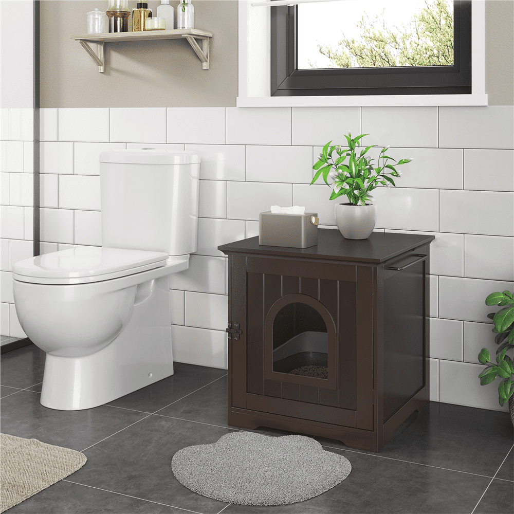 If you want a smart and attractive way to conceal a cat’s litter box; this enclosed cat litter box table will be the best choice. Not only hide the litter box inside and also match other home furniture; fitting most litter boxes. This table serves well as a side table; a decorative cat litter box; or a pet house. The tabletop can be a good place for your lovely ornaments or can be a small platform for your pet to rest on. Plus; there is a cat hole on the door panel; easy access for a cat going in and out.