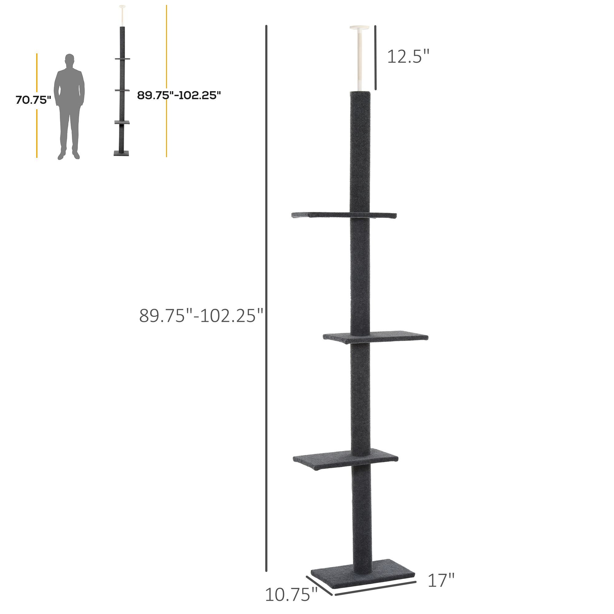 Tall Height: With a height range that adjusts to a colossal 8.5 feet, this cat tree stand is up to ceiling height, giving your kitties the most towering high places, accommodating what they love. The adjustability will adapt to your cat's preferences, whether they like a slightly shorter setting or they want to climb all the way to the top. This high-reaching big cat tree is mountainous and huge.