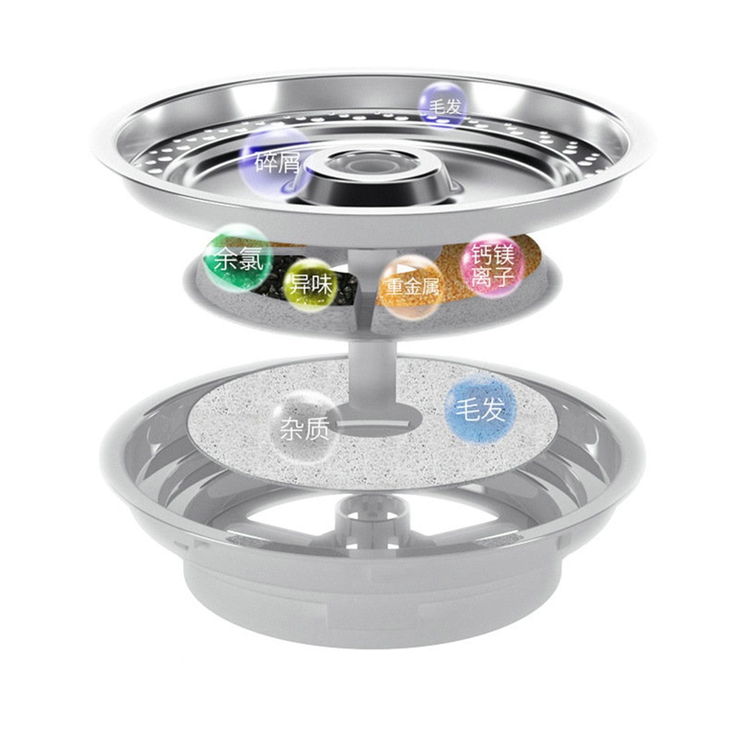 2.Stainless Steel Top - Upgraded pet fountain with high quality stainless steel top, unbreakable, durable and easy to clean. Stainless steel top is hygienic and dishwasher-safe. BPA free cat fountain is safe for your pets.
