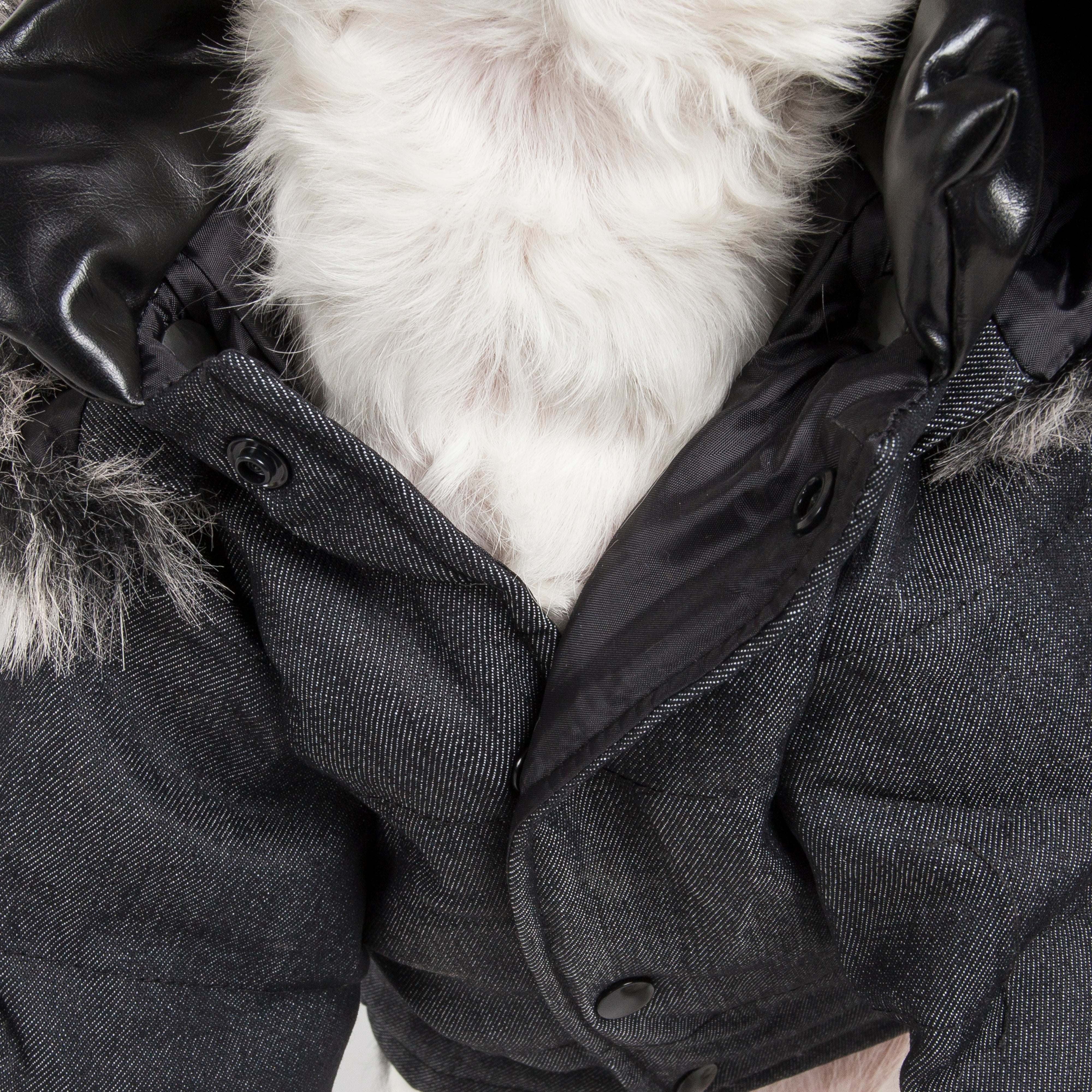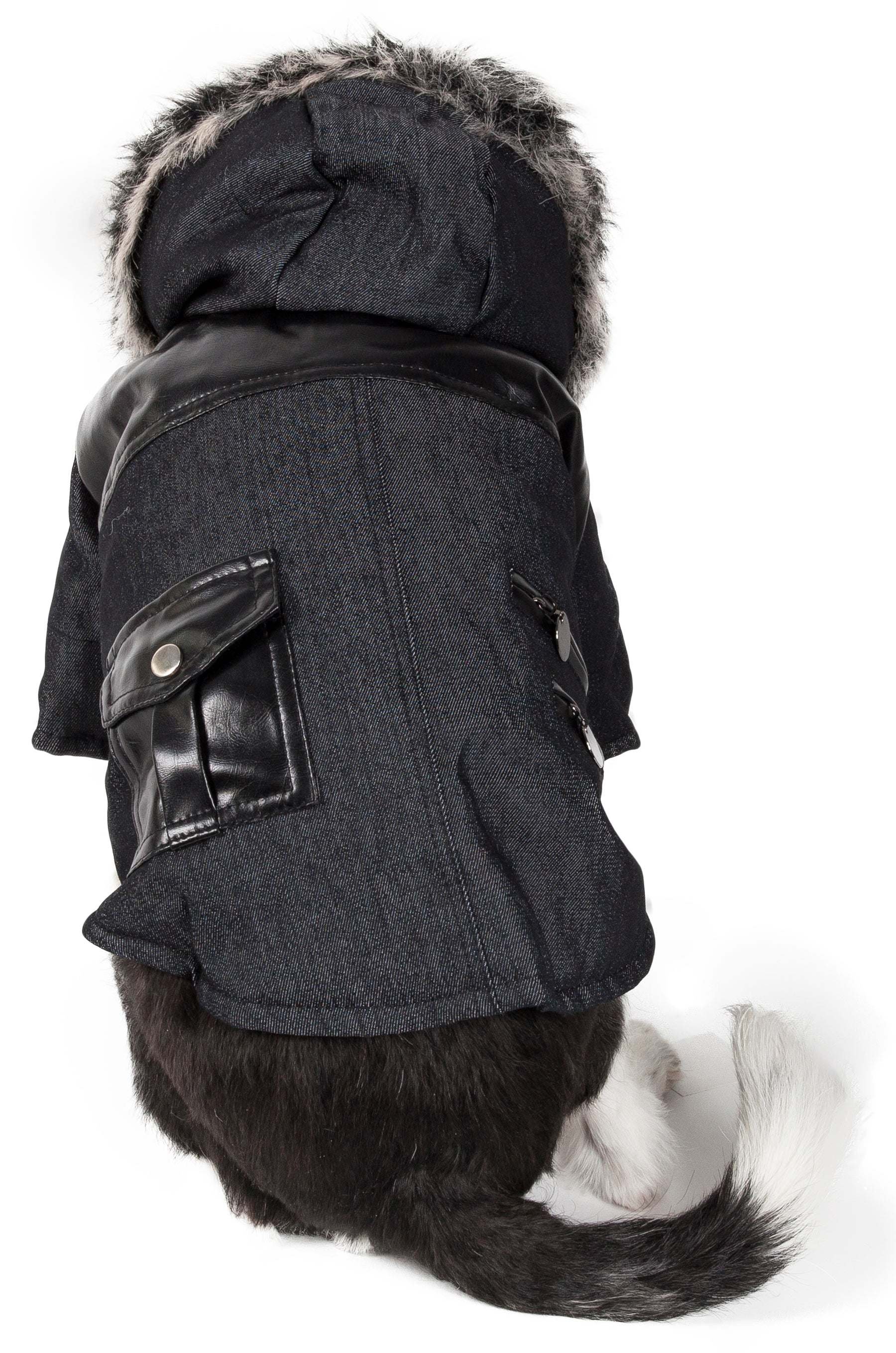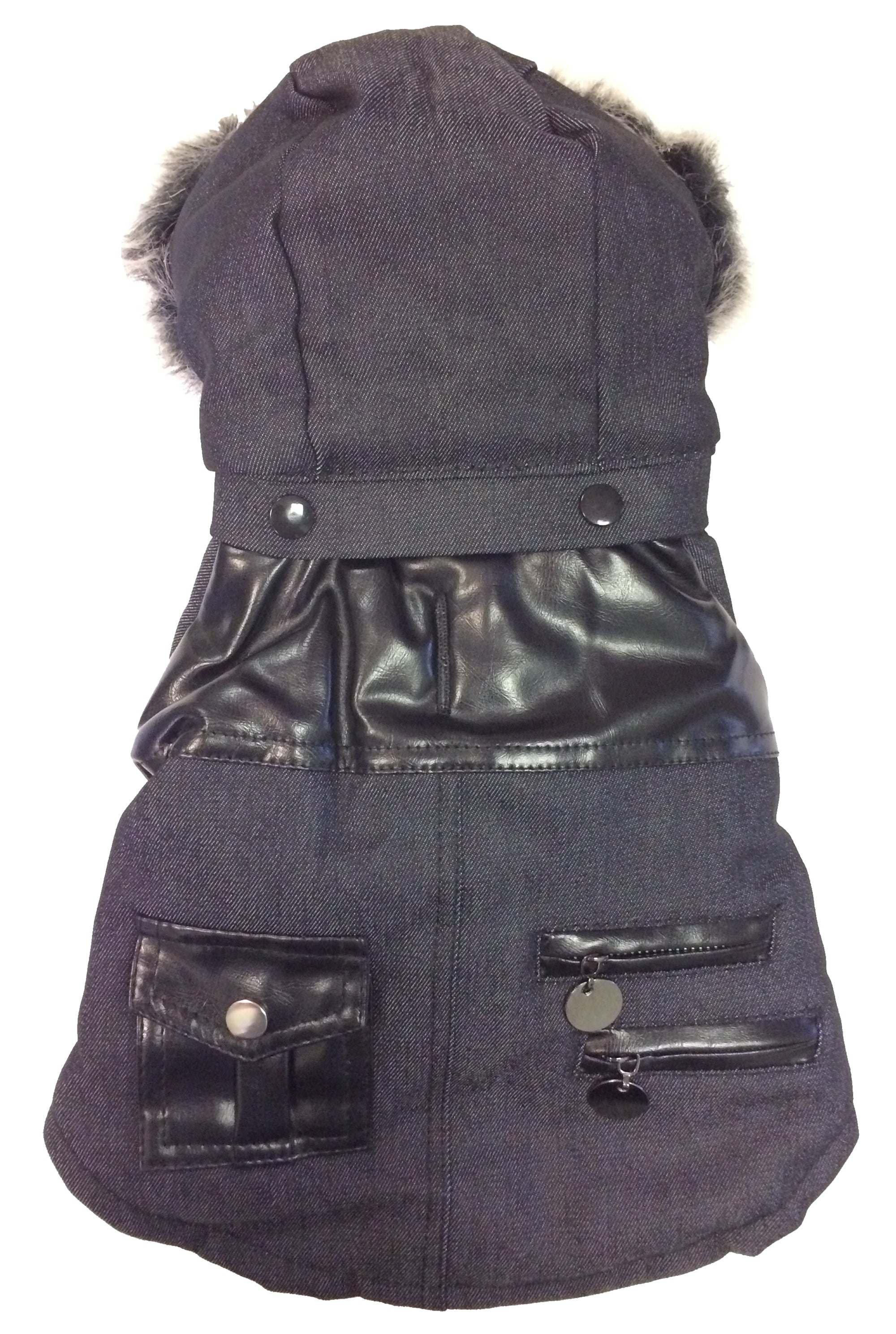The Pet Life 'Ruff-Biker' Fashion Dog Coat is composed of denim cotton and Plastic fabrics. This pet coat features a back-snap pocket and dual zippered accented pieces along the backside. This dog jacket also features a faux fur hood. Additionally, this pet coat features a snap button closure by the belly for easy on/off access and a leash slit holder behind the neck area. Available in multiple sizes.
