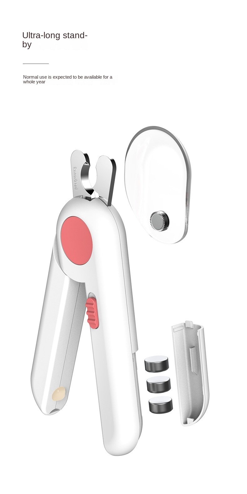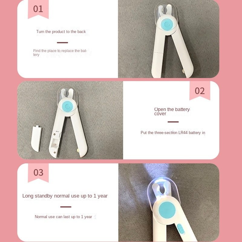 • [Bright LED Light]- The built-in ultra-bright LED light clearly illuminates the pet's nail bloodline; shows you exactly where to make cut to avoid damaging trimming. This innovative design can greatly reduce the risk of bleeding due to excessive trimming. 3Pcs LR44 battery included. Under normal use; the battery can run up to 1 year .