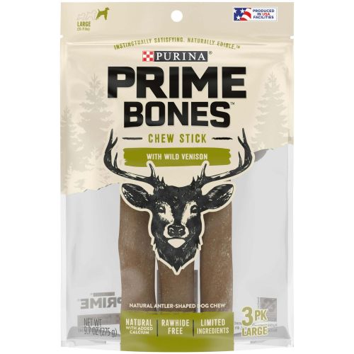 Purina Prime Bones Wild Venison Chew Stick Treats for Dog, Satisfy your dog's instinctual love of chewing with Purina Prime Bones Chew Stick With Wild Venison large dog bones. These extra-long-lasting, natural dog treats with added calcium are rawhide free and provide a safe and naturally edible treat that your large dog is sure to love. Each of these limited ingredient dog chew bones provides extra-long-lasting enjoyment with an antler-shaped chew to keep him entertained and thinking about his next big adventure in the wild. With big, untamed flavor, these dog bones for large dogs are just the right size for your large dog to chew, giving him rawhide free dog chews that help clean his teeth, too.