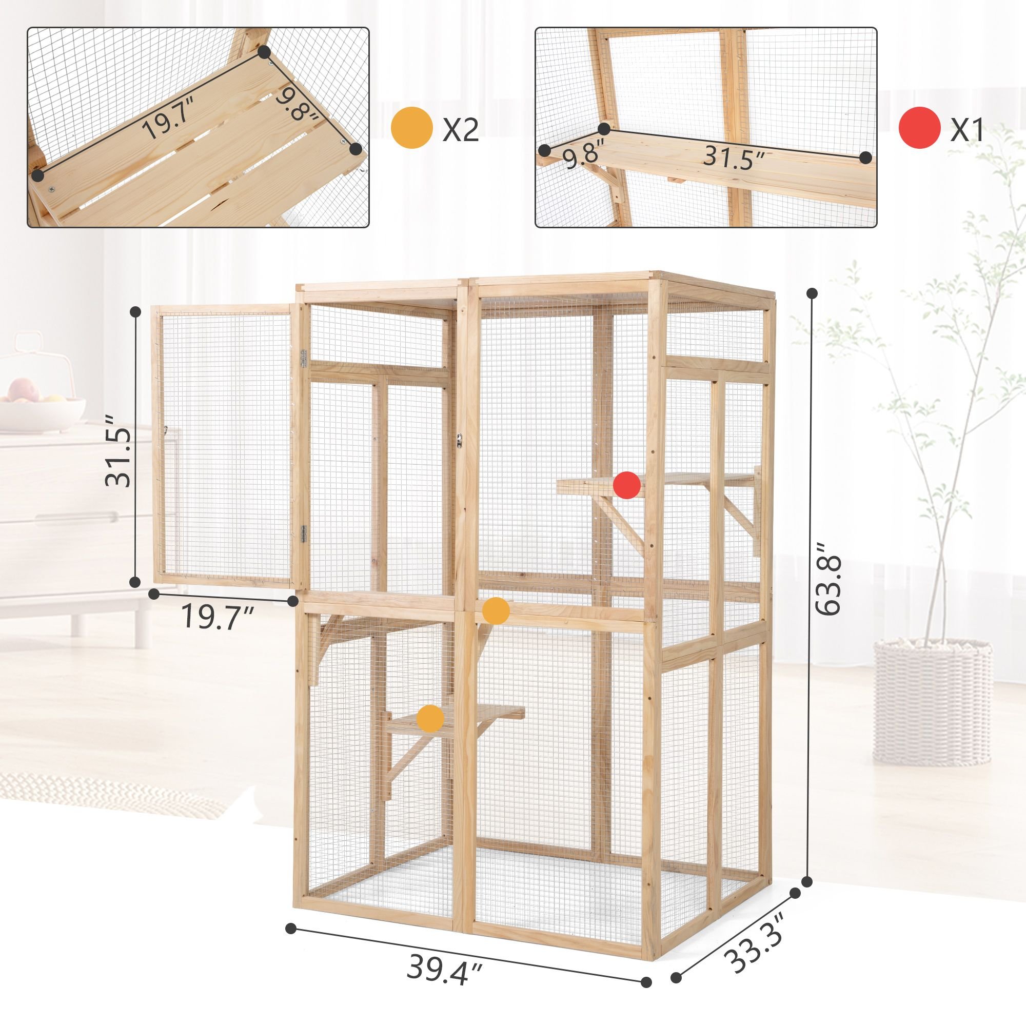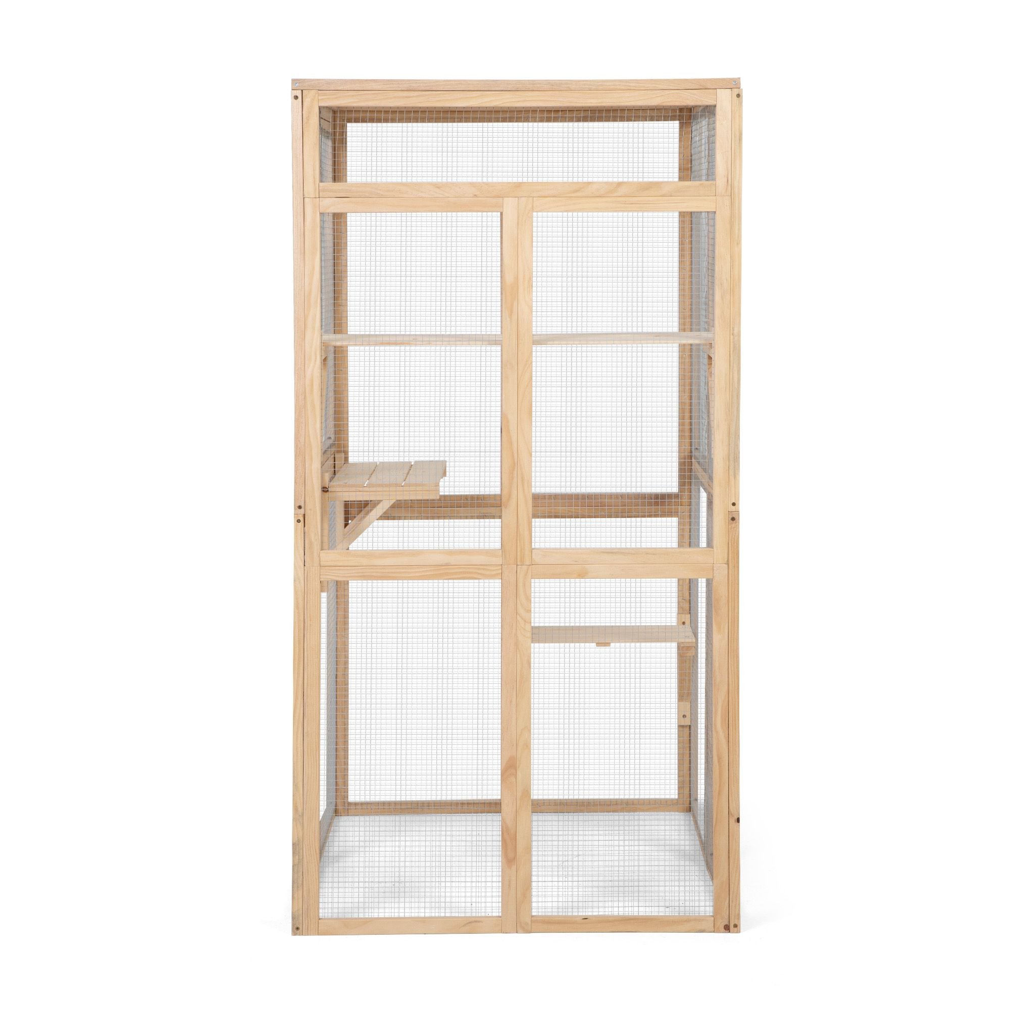 Wooden Cat Catio, Outdoor Cat Enclosure, Cat House with Platforms, Sunshine Board, Hammock, Door, Kitten Cage Condo, Burlywood Bullet Points: [An Outdoor Paradise for Cats]: Featuring 1 fabric hammock, 1 sunshine board and 3 jumping platforms, this cat catio outdoor doubles as a safe house and an all-in-one activity center, providing an ideal place to play, climb, and rest.[Safe and Comfortable Living Place]: Crafted of premium pine wood, this outdoor cat enclosure boasts a robust frame. The cat house has an ample living area with heavy-duty galvanized wire mesh to help air circulation.[Weatherproof with Sunshine Board]: Covered with a sunshine panel roof, this cat cage helps reduce the impact of harmful rays and shelter cats from rain. Your kitten can curl up on a shelf and sleep comfortably during unexpected showers.[Easy to Interact with Pets]: Featuring the wide front door, you can easily put your cats in and out of the cage without moving. The off-ground door makes daily activities easier and prevents cat from escaping when you open it.[Assembly without Effort]: Assembly requires one adult, following the step-by-step user manual. The installation time of the cat's cage depends on each person's manual ability.Color:BurlywoodMaterial: Pine Wood + Wire Mesh + PVCOverall Dimensions: 39"L x 33"W x 64"HSunshine Board Size: 33.07"L x 19.69"HLarge Platform Dimensions: 33.47"L x 7.87"HSmall Platform Dimensions: 19.69"L x 9.84"HMax. Platform Load Capacity: 44 lbsNet Weight: 43.65 lbs